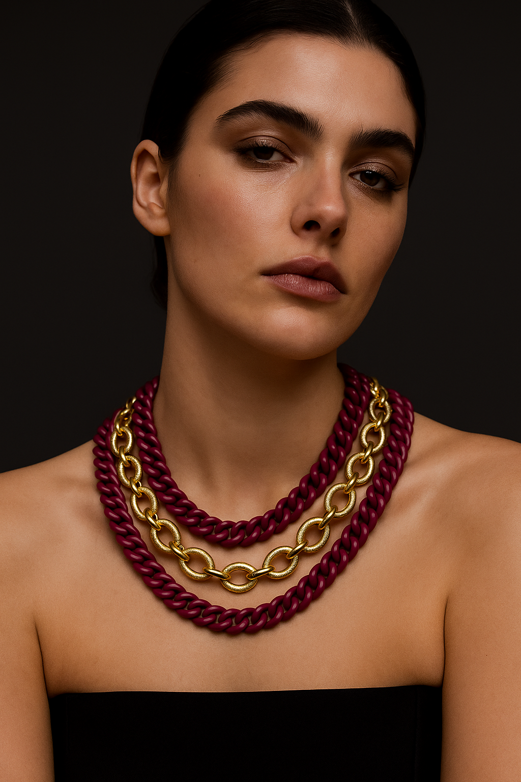 Central chain colour: gold Central chain type: hammered pattern with 24k gold galvanized aluminum base Colored chain: Nickel-free aluminum curb, treated with thick, wear-resistant glossy cherry-colored paint Closure type: Gold-colored carabiner Clasp material: Zamak snap hook with 24k yellow gold galvanic bath